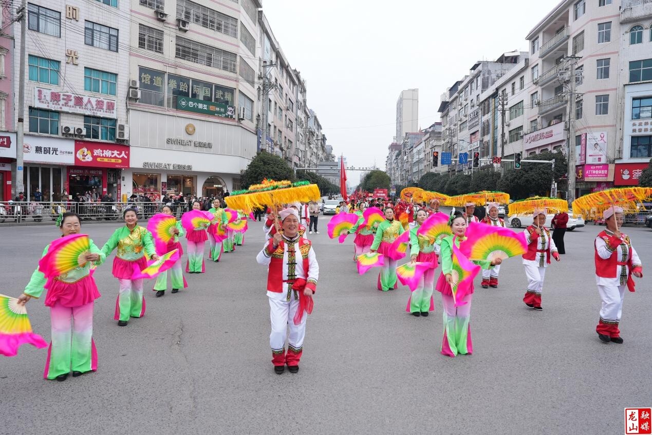 中午12点,伴随着欢快激昂的锣鼓声,游行活动在县城主街道正式拉开帷幕。由近600名演职人员组成的巡游队伍盛装出行,沿街巡演。队伍中,最引人注目的当属龙山文旅原创吉祥物——龙简简与秦哩哩,它们萌趣可爱的造型一亮相便瞬间点燃了现场气氛。